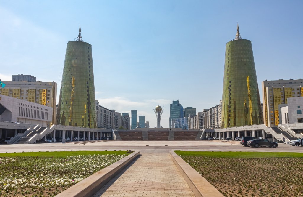 Apesar de suficiente esplendor capaz de competir, e porventura derrotar, certas capitais europeias eis que esta parte nova da capital ainda apresenta uns truques na manga. Imediatamente atrás da área do palácio presidencial e após atravessar-se o rio é-nos presenteado um tesouro egípcio – sim egípcio! – conhecido localmente como o palácio da paz, este presenteia-se como uma magnífica pirâmide azul. Por sua vez, do outro lado da estrada uma monstruosa e complexa praça aparece algo aleatoriamente sendo acessível via uma estrada tão longa e larga que quase parece uma pista de aeroporto. Esta trata-se nada mais, nada menos do que a praça da independência marcada por um belíssimo e detalhado monumento em honra ao povo cazaque ao longo dos séculos
